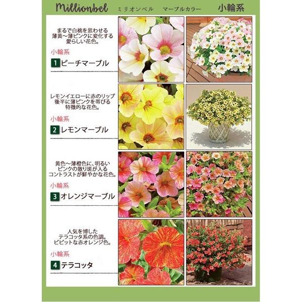 サントリーの苗入荷情報、第一弾を 前のブログで紹介しましたが gpyamachohatenablogcom 今回は、専門店限定のシリーズを紹介します♪(*^ ^*) 専門店限定のミリオンベル♪ カラーが専門店限定になります♪(∩´∀`)∩ テラコッタ レモンマーブル オレンジマーブル ピーチマーブル 専門店限定ガーデニングの基本的な流れやサントリーフラワーズで扱っている商品の育て方をご紹介いたします。 ※1 例)ミリオンベルは、赤玉土(中粒):腐葉土:軽石=5:2:3品種 ナス科カリブラコア属 (基本的に1年草) サントリーフラワーズの園芸品種です。 花期 4月~10月ごろとされていますが、我が家では11月末辺りまで咲いています。 ミリオンベル育て方ポイント;